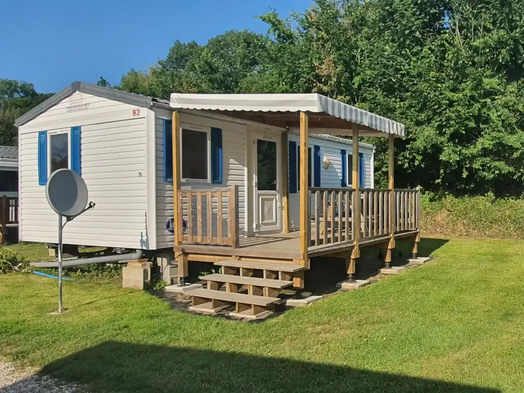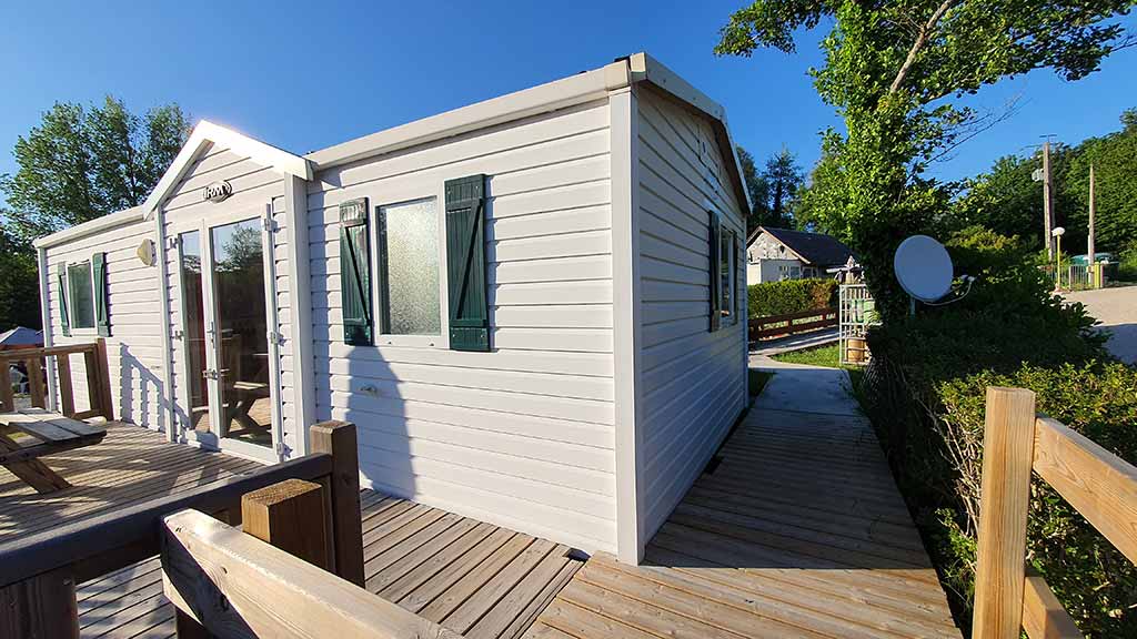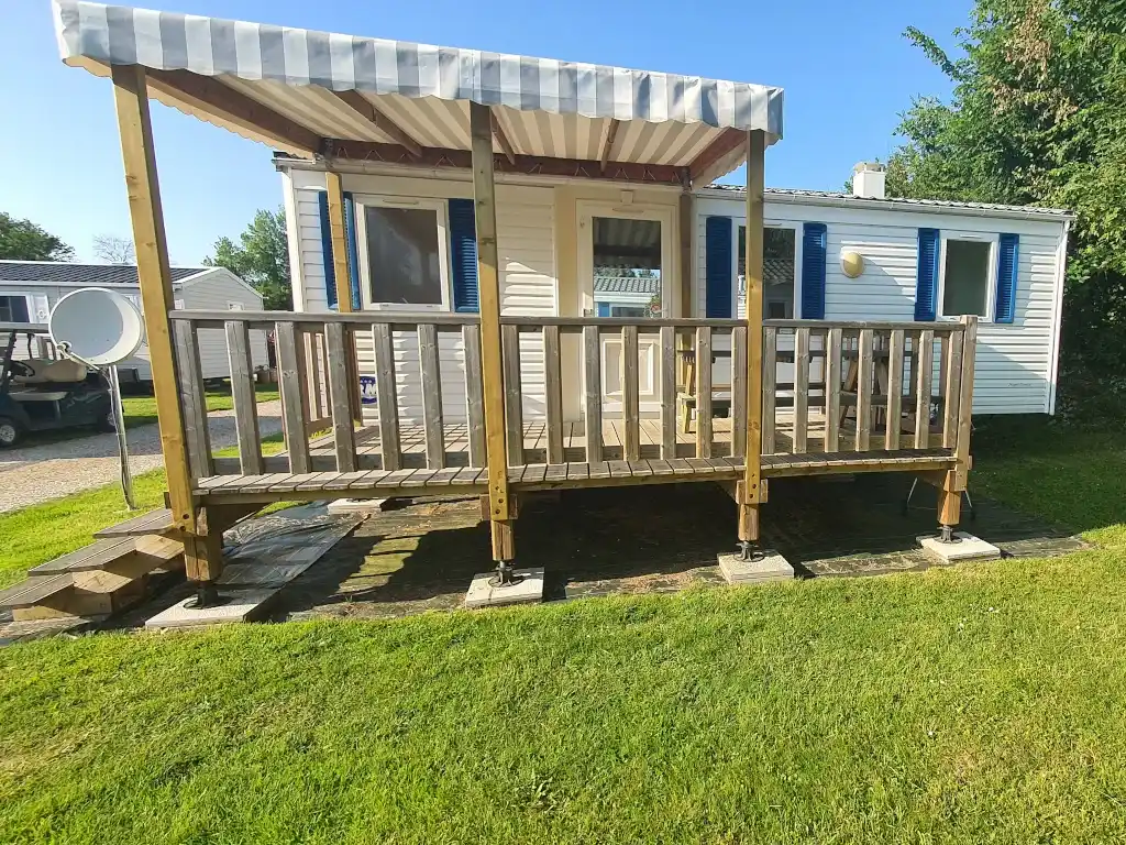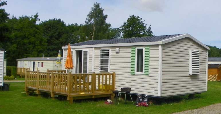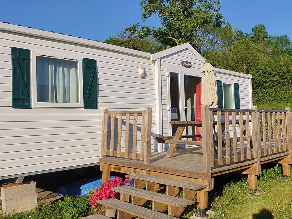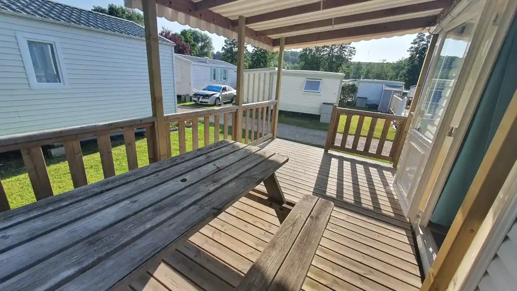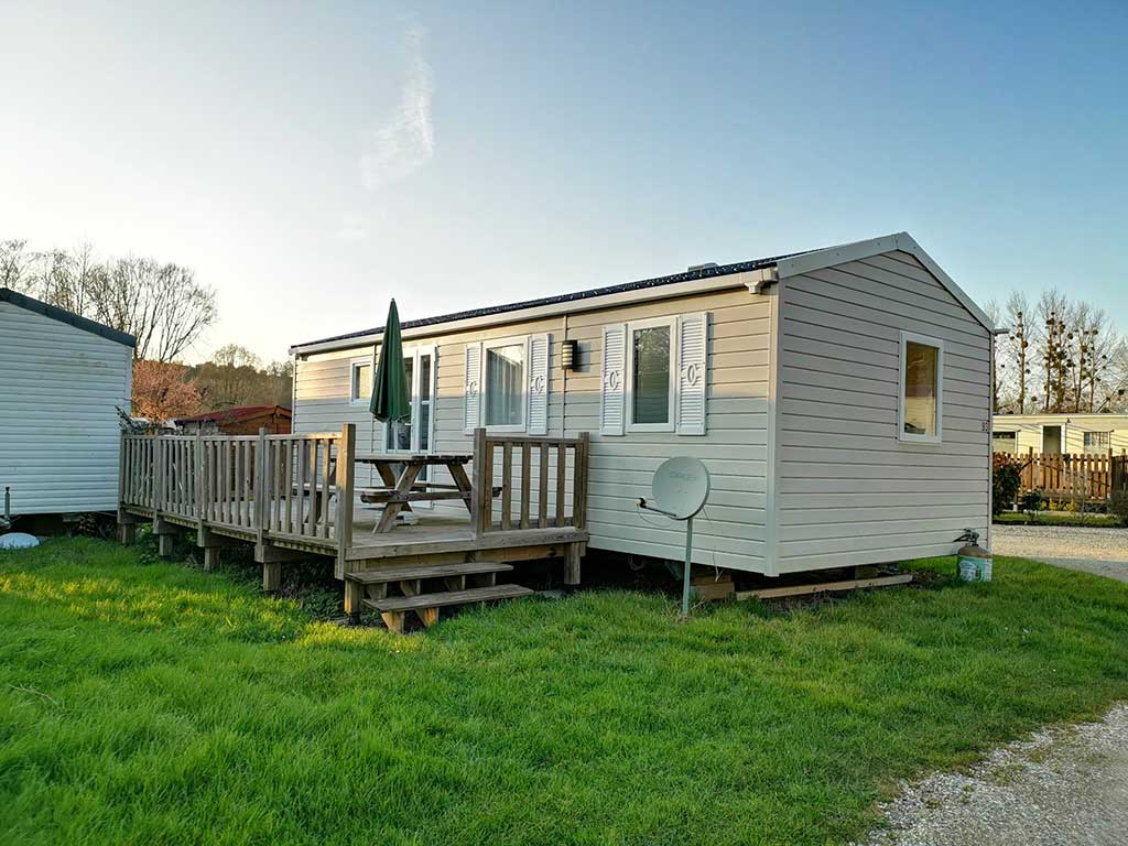 Mobil-homes économique tout confort avec terrasse, table et barbecue.